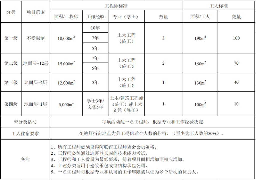 于2024年2月14日公布的《建筑承包与钢结构承包的许可与评估标准》(Criteria for licensing and evaluating (Building Contracting) & (Steel Contracting)),承包商等级根据不同条件区分为四个等级,同时,该文件对未分类活动和工人住宿等也提出了要求,具体如下: